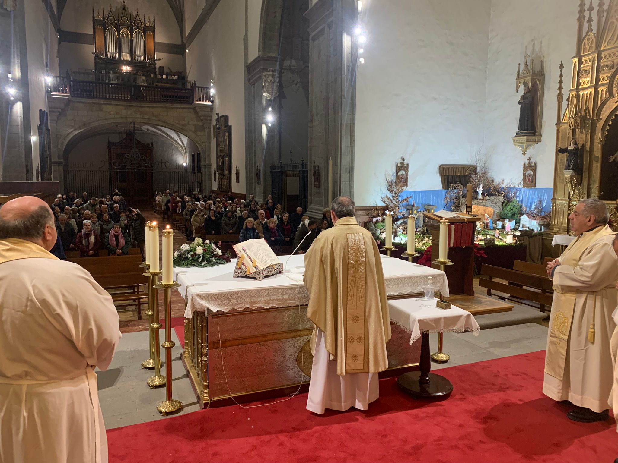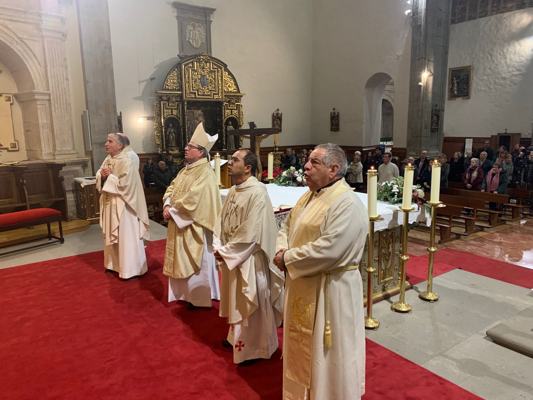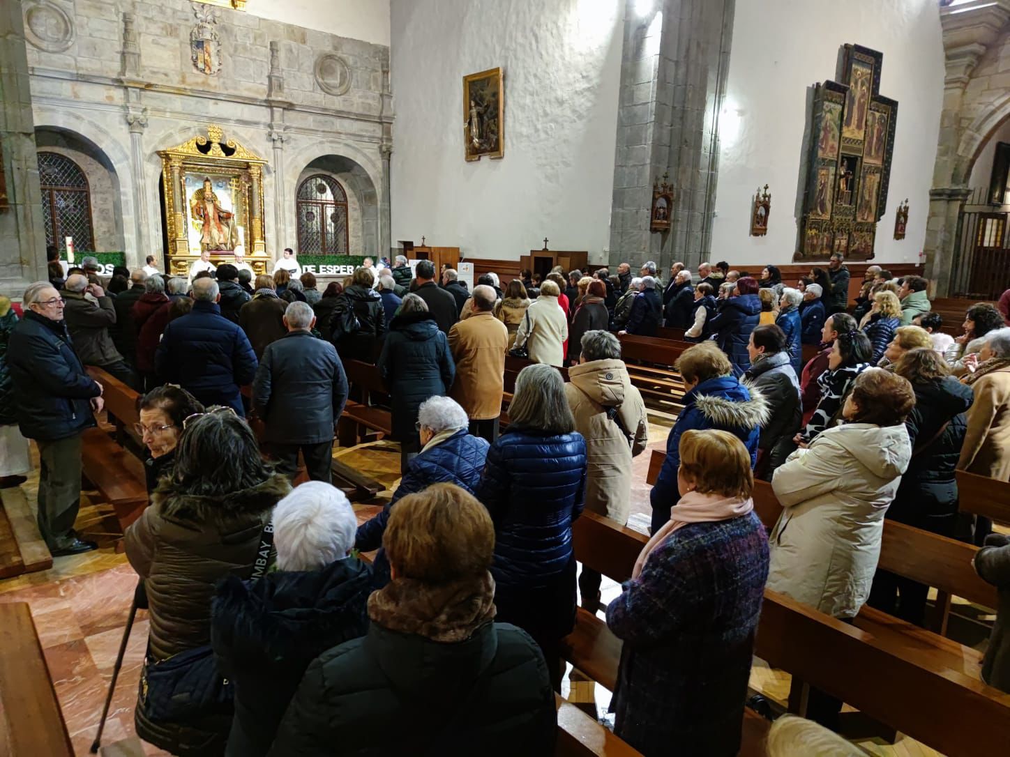 Seguidamente, comenzó la solemne eucaristía, presidida por el Obispo, al que acompañaban el párroco de Ágreda, Alberto Blanco, y varios sacerdotes del Arciprestazgo. En su homilía, D. Abilio glosó la importancia de vivir un año jubilar, como fuente de esperanza y presencia de Cristo resucitado en la Iglesia. Hizo referencia a su origen en el Antiguo Testamento y al deseo de su santidad el Papa Francisco de renovar la virtud teologal de la esperanza en la vida cotidiana de los cristianos. Durante la celebración, los coros parroquiales animaron al canto. Concluyó la inauguración con el himno a la titular del templo.