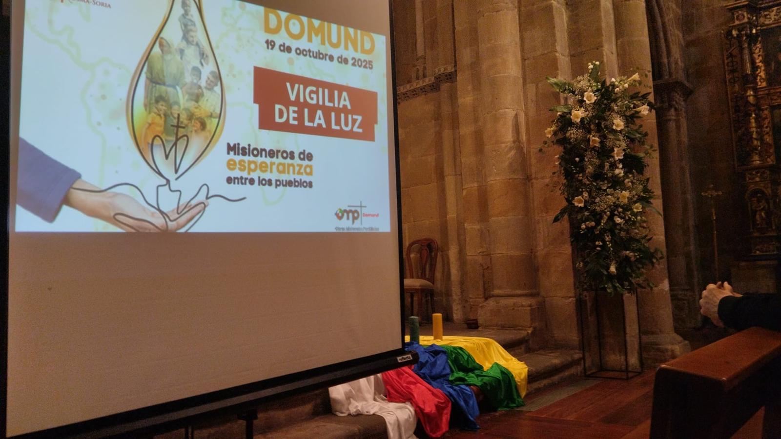 El día 19 de octubre, la Iglesia celebró la Jornada del Domund bajo el lema «Misioneros de esperanza entre los pueblos”. La delegación de misiones de nuestra diócesis organizó dos actos en torno a esta jornada; el sábado, día 18, a las 20h, tuvo lugar en la Iglesia de San Juan de Rabanera de Soria, la Vigilia de la Luz que fue presidida por el consiliario de la delegación, D. Álvaro Chávez. La celebración central tuvo lugar el domingo con una Eucaristía presidida por el Administrador Diocesano, D. Gabriel Ángel Rodríguez Millán en la parroquia de Santa Bárbara de Soria. Su homilía estuvo centrada en la fuerza de la oración y la esperanza como motores de la misión. A partir de la parábola de la viuda perseverante, subrayó que “orar siempre, sin desfallecer” significa mantener la fe incluso cuando no se ven resultados. Recordó también la imagen de Moisés con los brazos sostenidos por Aarón y Jur como símbolo de la Iglesia que se apoya mutuamente: unos oran, otros anuncian y todos comparten la misma misión. El Administrador insistió en que la verdadera misión nace de la Palabra de Dios y se expresa en los gestos cotidianos de cercanía, perdón y alegría. En sintonía con el lema de la jornada (“Misioneros de esperanza entre los pueblos”), invitó a mirar el mundo con los ojos de Dios y a ser testigos de esperanza en medio de las dificultades. Concluyó animando a la comunidad a renovar su fe y su compromiso misionero, recordando que “la misión no es un lugar, sino el fuego del Evangelio que transforma todo lo que toca”.