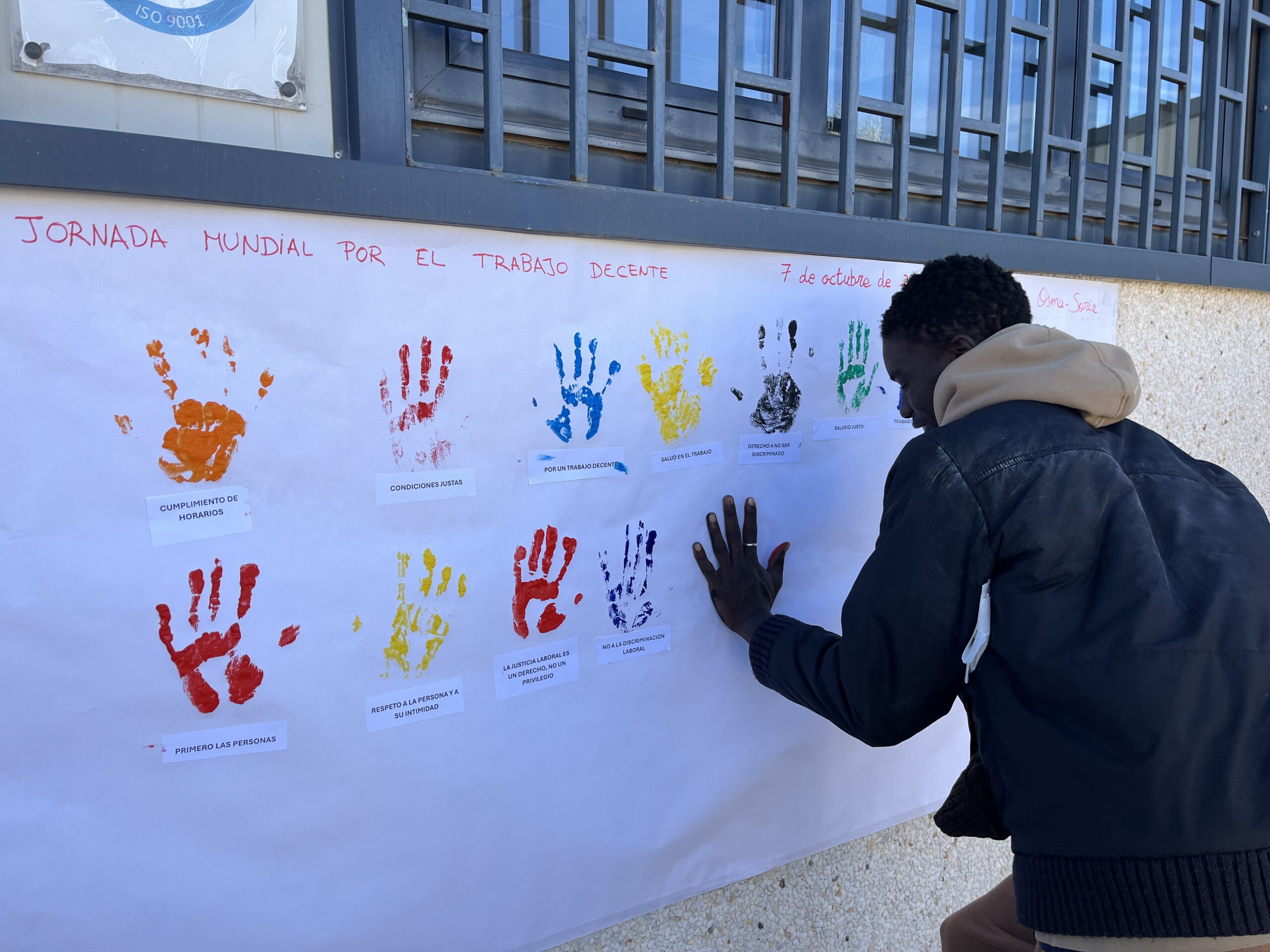El día 7, a las 12 de la mañana, en el Centro de Formación de Cáritas tuvo lugar el gesto: “Nos pringamos por un trabajo decente” en el que cada participante pintó una de sus manos y la estampó sobre un mural de papel. Debajo de la huella, se pegaron frases relativas al trabajo decente.