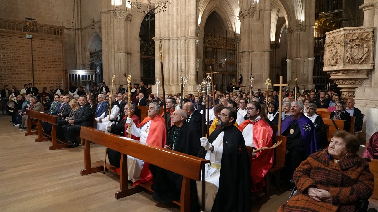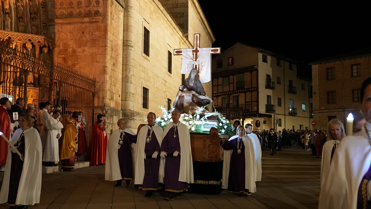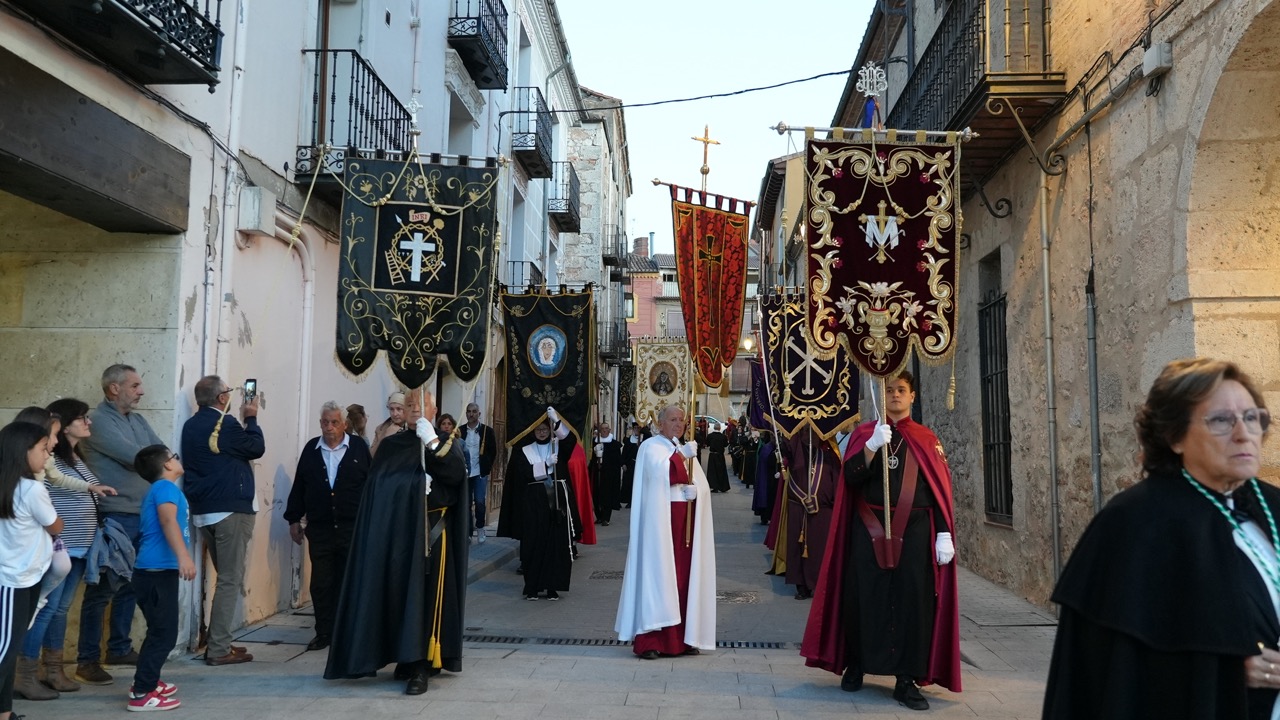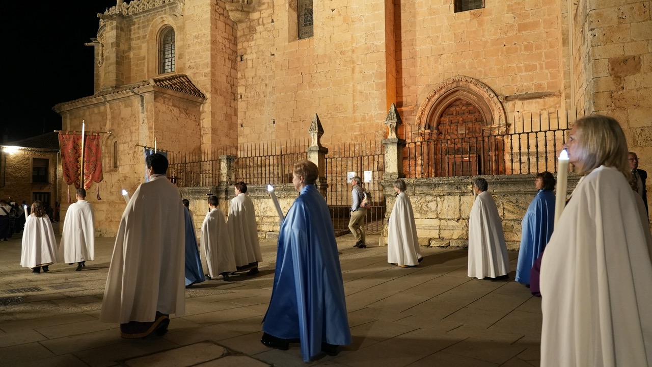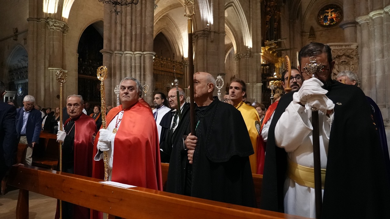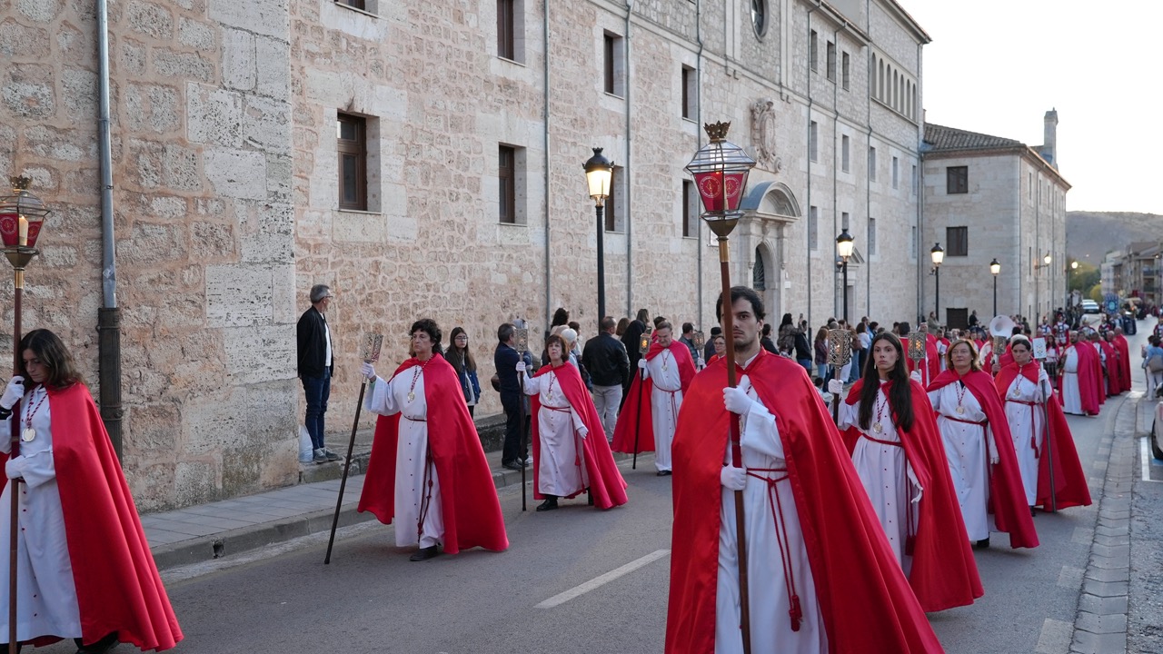 La actividad oficial ha comenzado a las seis de la tarde en la iglesia del Carmen con un acto penitencial necesario para ganar el Jubileo. Tras él, partía la procesión por las calles burgenses pasando por el Seminario, plaza Mayor y calle Mayor antes de desembocar en la plaza de la Catedral y entrar el templo por la puerta de San Miguel. El Administrador diocesano de Osma-Soria, Gabriel Ángel Rodríguez Millán, ha presidido una emotiva eucaristía en la que ha destacado el papel de las cofradías como custodias vivas de la fe y la esperanza en los pueblos de la diócesis. En su homilía, subrayaba que “la victoria del pueblo de Dios no depende de la fuerza, sino de la fe”, invitando a los cofrades a ser “oración en movimiento” y testigos alegres del Evangelio en medio del mundo. El Administrador alentó a redescubrir la esencia del Evangelio, a perseverar en la oración y a vivir con confianza y esperanza, recordando que “Cristo no vino a buscar perfectos, sino a levantar al que cayó y encender la llama en el que ya no creía”.
